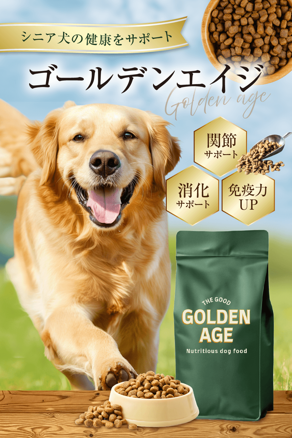 - 愛らしいゴールデンレトリバーの笑顔と、具体的な栄養素を示すアイコン(関節・消化・免疫力) を配置することで、製品が提供する健康効果と信頼性を視覚的に訴求しました。