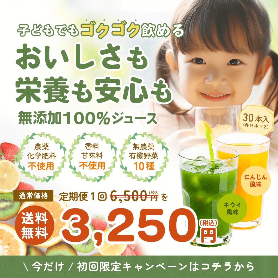 「子どもでもゴクゴク飲める」 をキャッチコピーに、美味しさ、栄養、そして無添加の安心感 を兼ね備えたジュースのキャンペーンバナーを制作しました。初回限定の特別価格 を強調し、健康志向の家族層の購買意欲を促進することを目的としています。