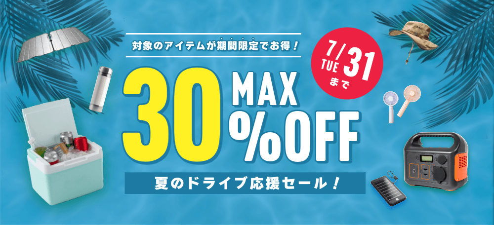 「夏のドライブ」というテーマで、季節感を演出し、ターゲット層の購買意欲を刺激すること。主要なセール情報(割引率、期間、対象商品)を明確かつ視覚的に魅力的に伝えること。ポートフォリオに掲載するため、デザインプロセスの思考と改善能力を示すこと。